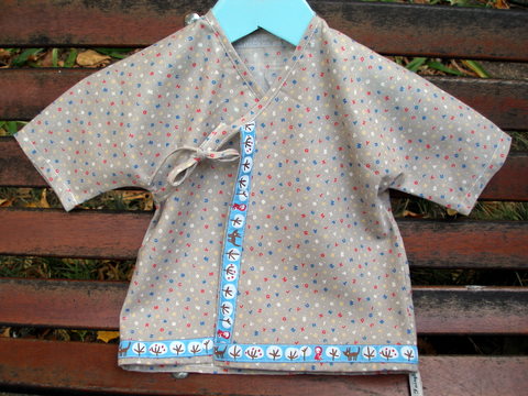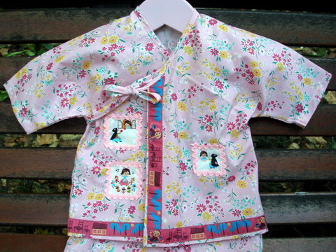 Há dois novos conjuntos de calças e kimono, muito apetitosos para os bebés, fáceis de vestir, feitos com tecidos macios de algodão e embelezados com galões da Rosa.