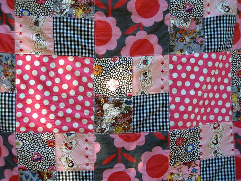 Bem, este não tem “recheio” de baeta de algodão, nem tecido por trás. O patchwork foi cosido e pespontado directamente numa colcha de algodão branco. Já anteriormente fiz outros (aqui e aqui) com esta técnica, que é a forma tradicional portuguesa das “mantas de retalhos”, já que todas as que vi até agora (novas ou velhas) são na sua maioria executadas desta mesma forma – o patchwork cosido em cima de uma colcha velha ou cobertor puído, como esta com cerca de 60 anos, que herdei na minha bisavó e foi feita pela minha trisavó.