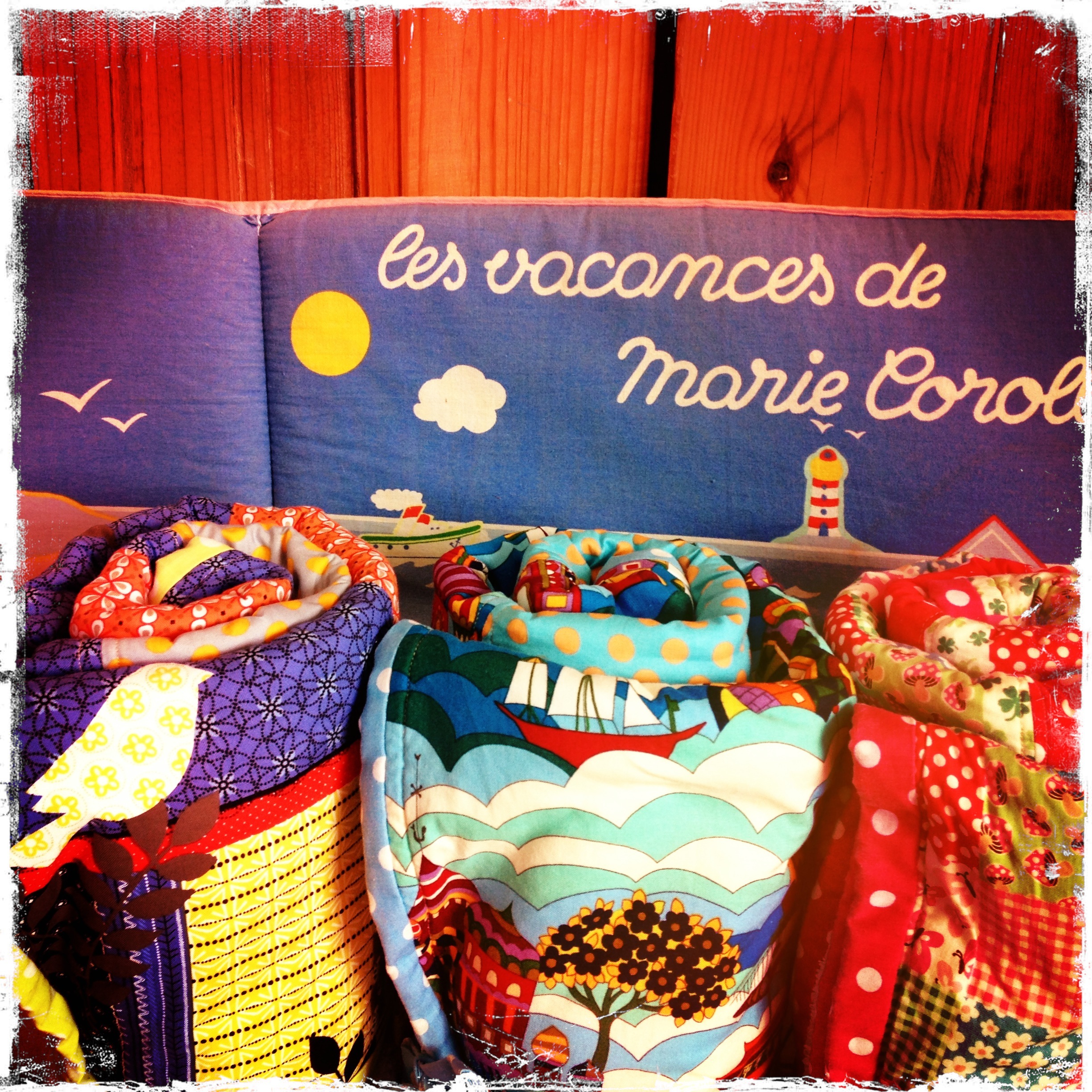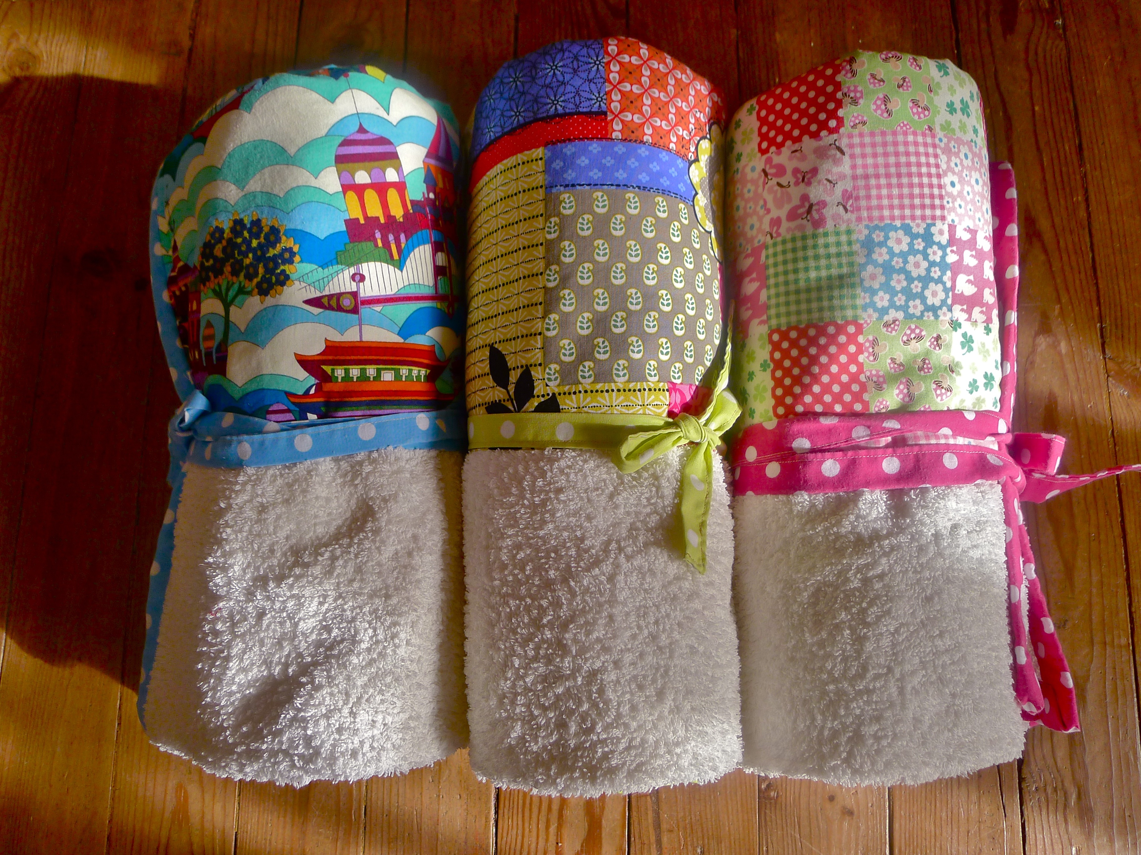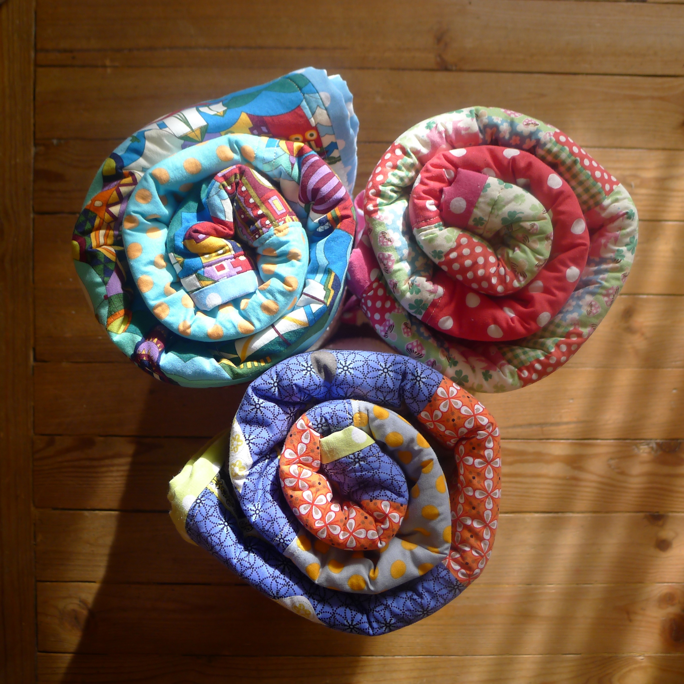 feitas em turco de cor crua, com aplicação de barra de patchwork, debruadas com tecido às bolinhas e com atilhos para enrolar e transportar.