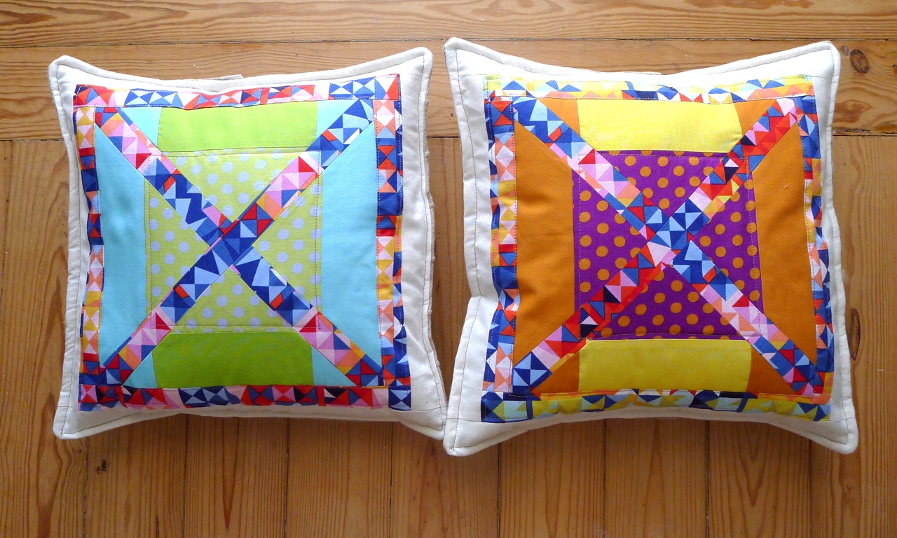 para aproveitar todos os bocadinhos de tecido até ao fim, e em especial dois blocos que não cheguei a utilizar, fiz ainda duas almofadas a condizer, com abertura tipo envelope.