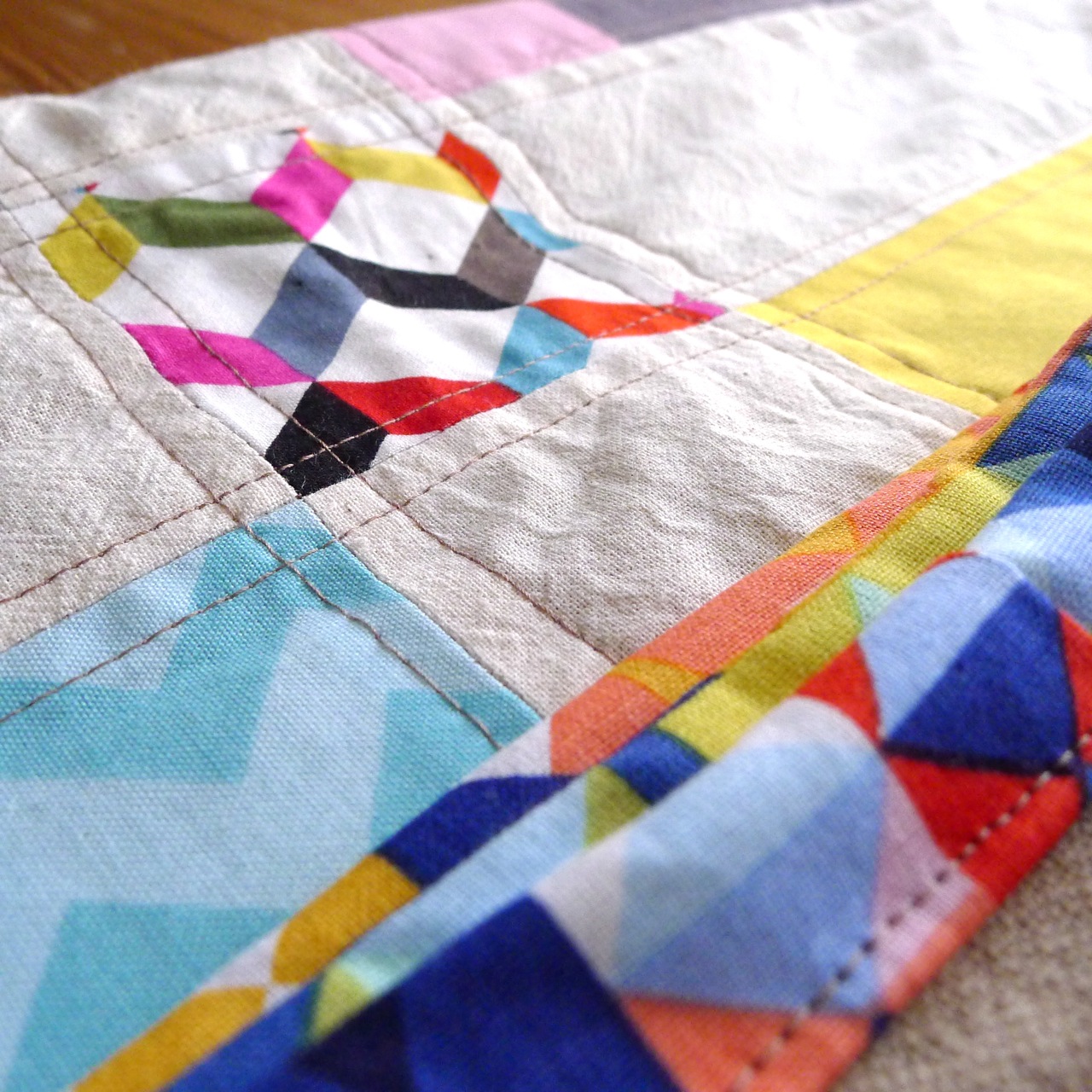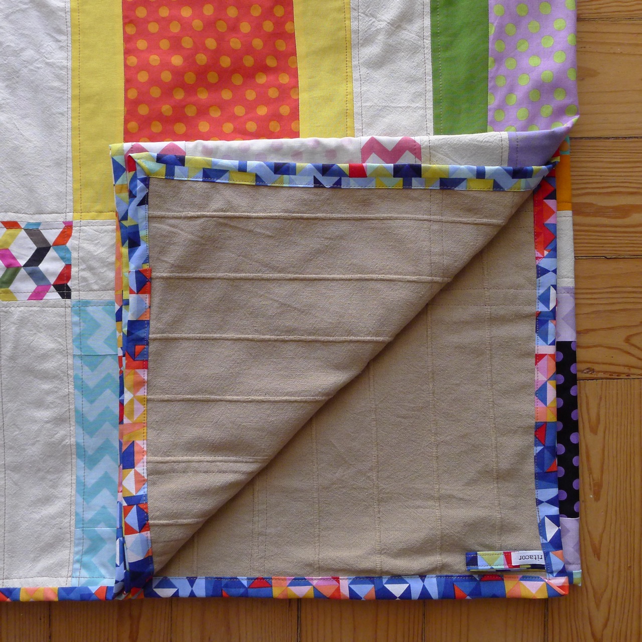 é composta por blocos quadrados: tecidos de bolas a duas cores (kaffe fassett spots), e uma cercadura de tecidos lisos (kona cotton solids) ou de zigzag (riley blake chevron). a juntar tudo, um sashing em pano cru e uns apontamento de um lindo tecido gráfico (ziggy da windham fabrics). na cercadura usei outro tecido gráfico bastante colorido (prism da michael miller).