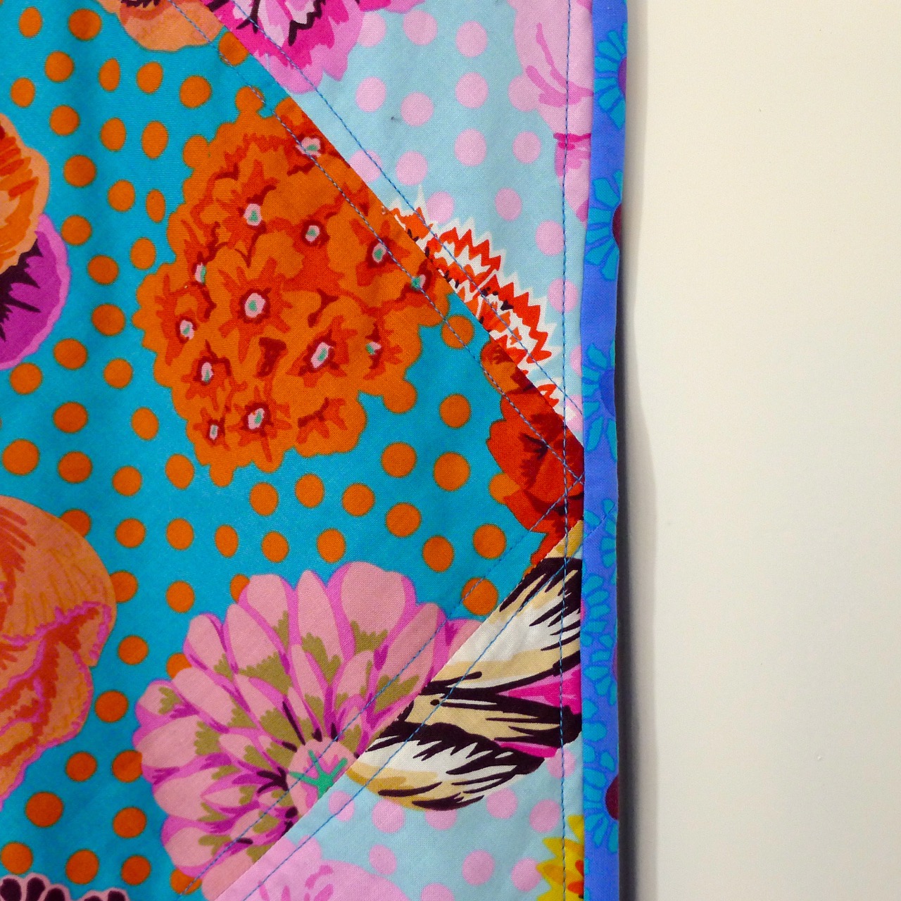 fazer o acabamento desta maneira torna mais fácil trabalhar grandes dimensões numa vulgar máquina doméstica, e não compromete por aí além a estética da peça, na minha opinião. já o fiz várias vezes, com resultados bastante positivos, e esta manta é mais um exemplo desse tipo de acabamento.