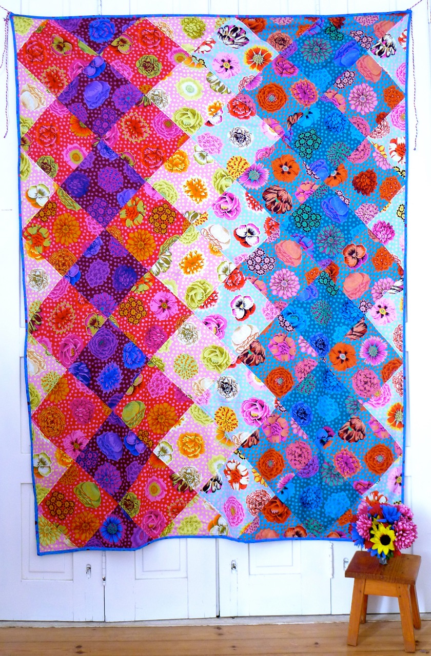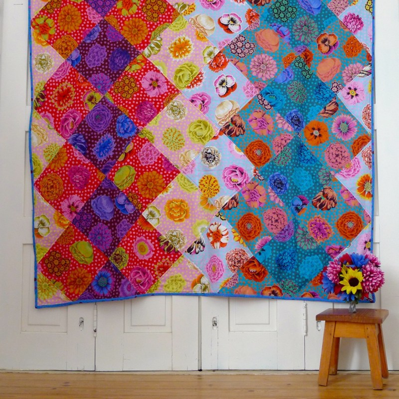 foi feita em janeiro de 2010 para ilustrar um workshop de quadrados. na altura entusiasmei-me com o padrão do tecido que lhe dá o nome (que entretanto já ganhou 4 novas cores), e acabei por fazê-la em medidas bastante generosas: 1,50m largura x 2 m largura.