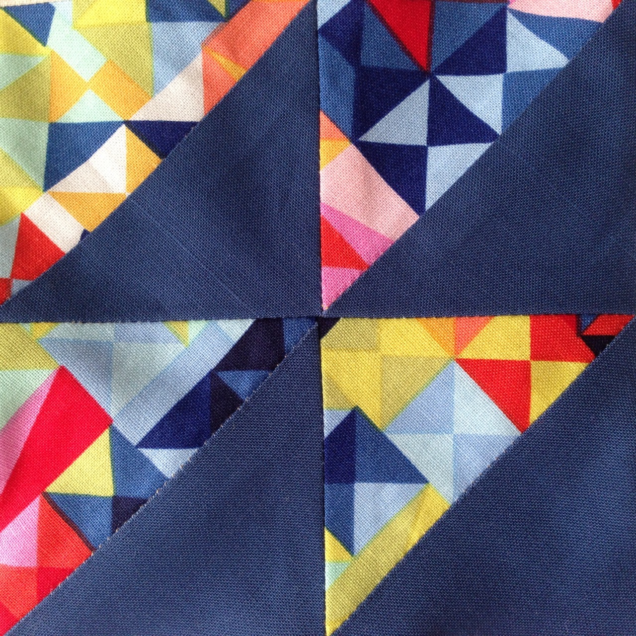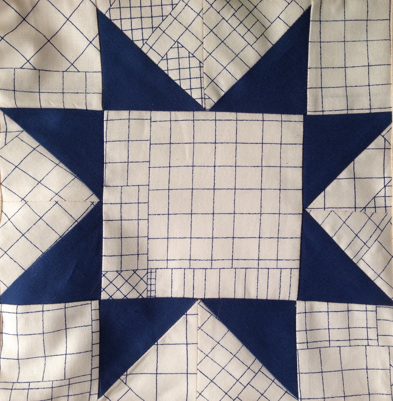 um é em tons de azul e branco, com uma estrela de patchwork, e outro em azul e padrões coloridos, com triângulos de patchwork.