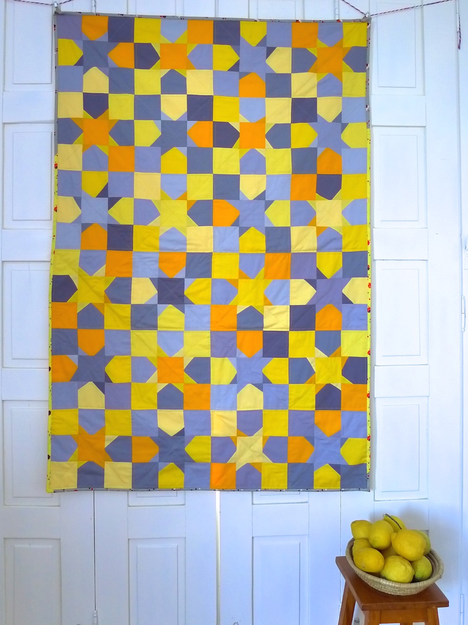 no avesso e no debrum usei um clássico da coleção “Flea Market Fancy” nos mesmos tons de amarelo e cinza. como enchimento, usei flanela de algodão, para lhe dar um ar mais leve e fresco, adequado aos dias de verão. pespontei com linhas verticais, horizontais e diagonais com duas cores de linhas: cinza e amarelo.