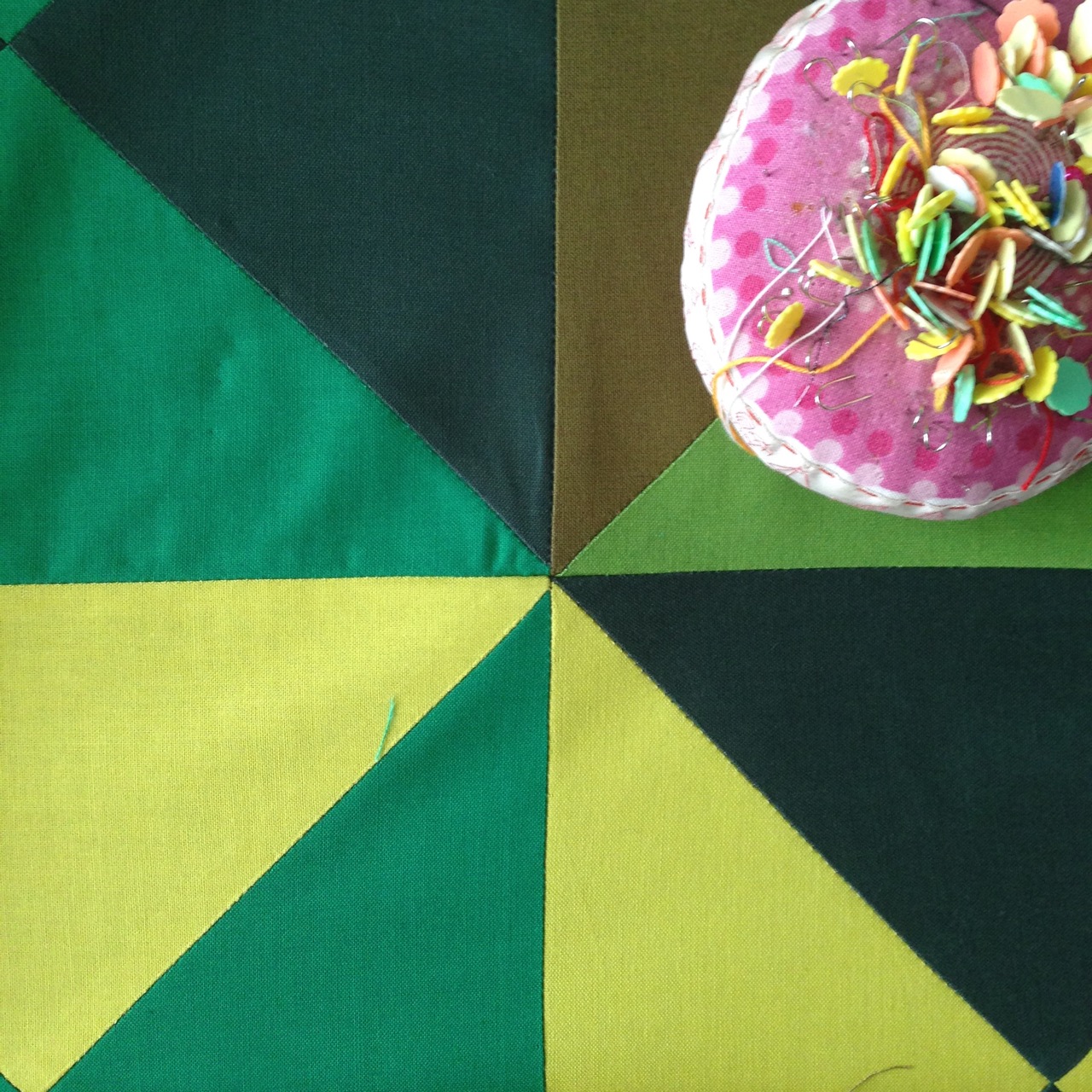 7 verdesfoi assim que começou este quilt: 7 tons de verde em cima da bancada de madeira.