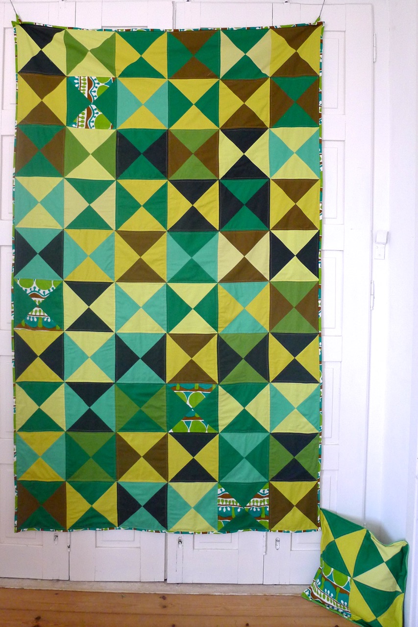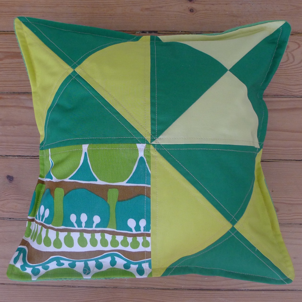 a eles juntaram-se 2 quadrados de um tecido verde, antigo, que tinha exatamente os mesmos tons dos verdes escolhidos
