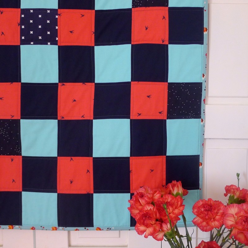 não é propositado – ou se calhar é fruto dos tecidos que tenho trabalhado ultimamente, mas as minhas mantas de primavera têm sido quase todas construídas à volta das mesmas cores: azul, vermelho-coral e amarelo.