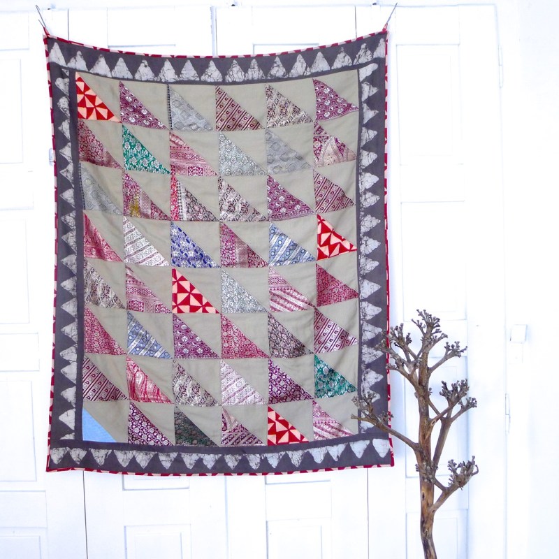 a forma imperfeita de cada half-square triangle é propositada. primeiro, porque seria muitíssimo difícil conseguir uma perfeição com este tipo de tecidos, e com as pequenas diferenças de milimetros que têm entre si, segundo, porque o patchwork tradicional indiano é tudo menos escravo da perfeição. aliás, é a na sua diversidade e pequenos detalhes que reside a autenticidade que lhe é característica.