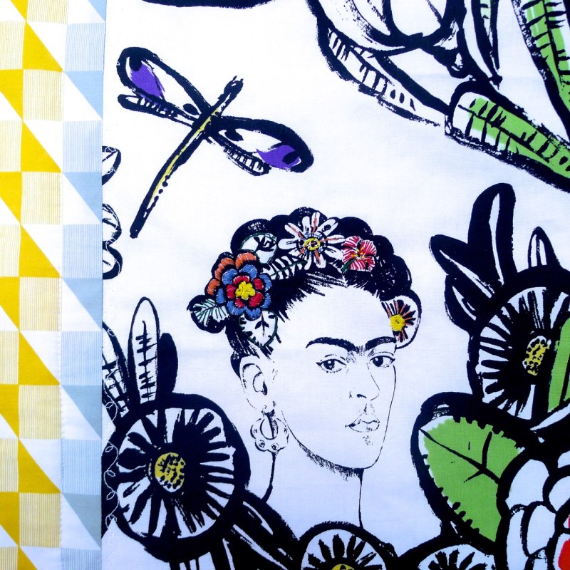 para completar esta composição, que é feita em log cabin à volta do painel central, escolhi uns padrões floridos e de pássaros exóticos da Cotton +Steel (que tinha usado também neste painel Frida Kahlo) e dois padrões de patchwork da Cloud9 e da Art Galery Fabrics.