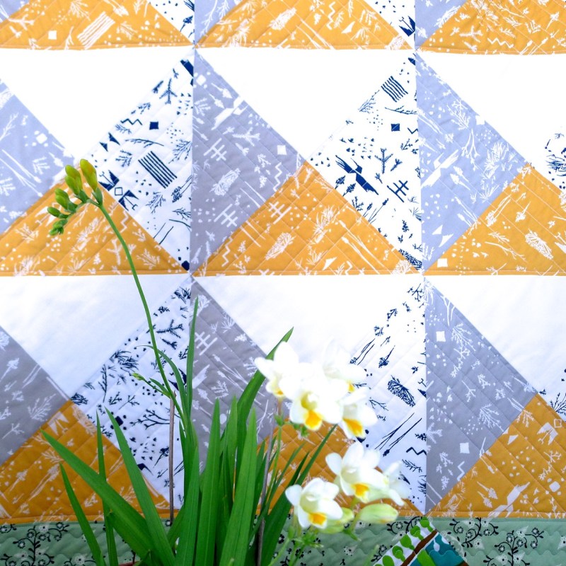 quando estava a fazer blocos de teste com os tecidos, fiz um bloco que depois de repetido me fazia lembrar uma montanha com o topo chio de neve.