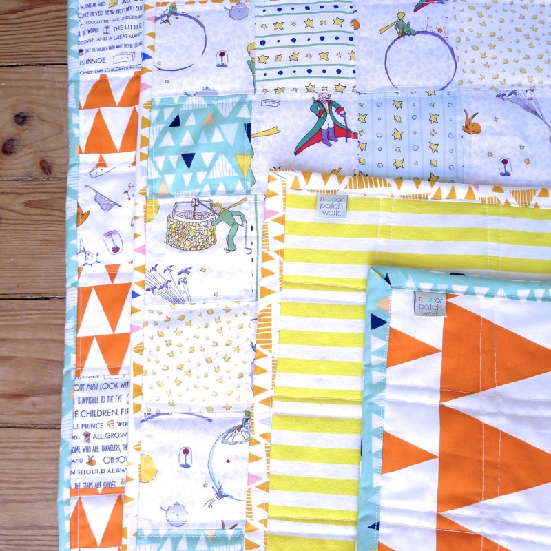 os célebres desenhos da jibóia e dos carneiros, outro com a imagem icónica do Principezinho fardado a rigor e outro com excertos do livros e pequenas ilustrações. usei apenas um tecido coordenaste, com triângulos brancos e laranja: