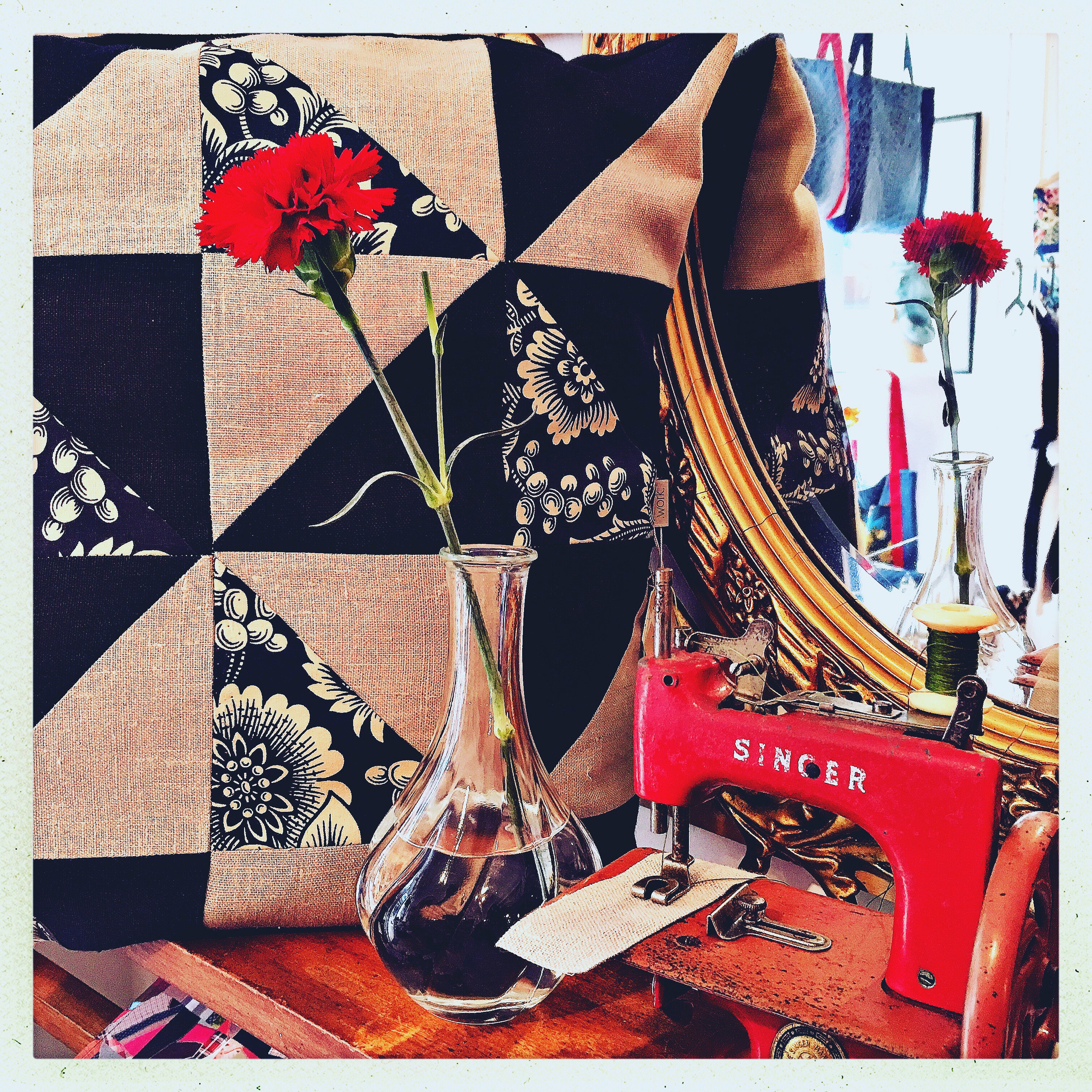 tenho passado todos os dias no atelier, o que me deixa muito feliz e realizada, mas aqui não há lugar para computadores, só para máquinas de costura, agulhas, tecidos e linhas.