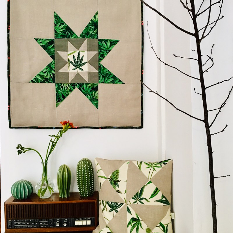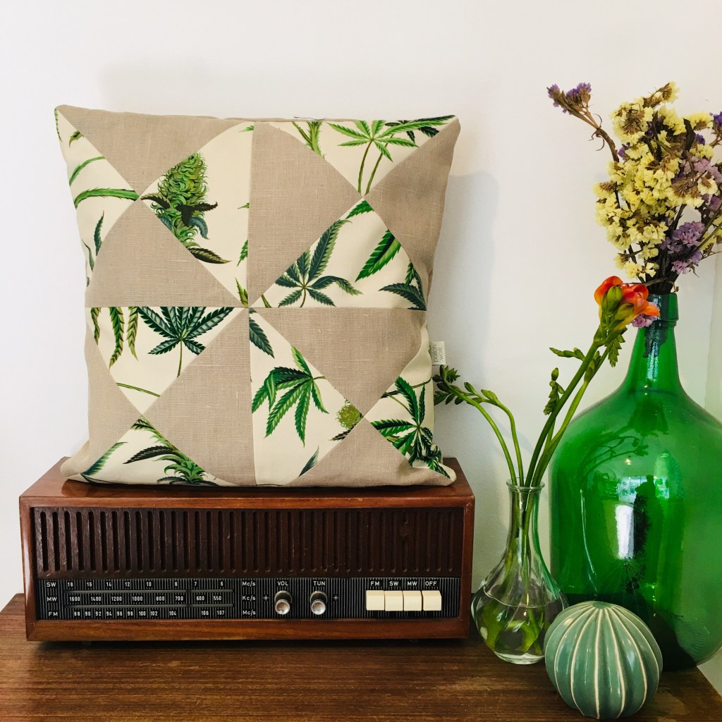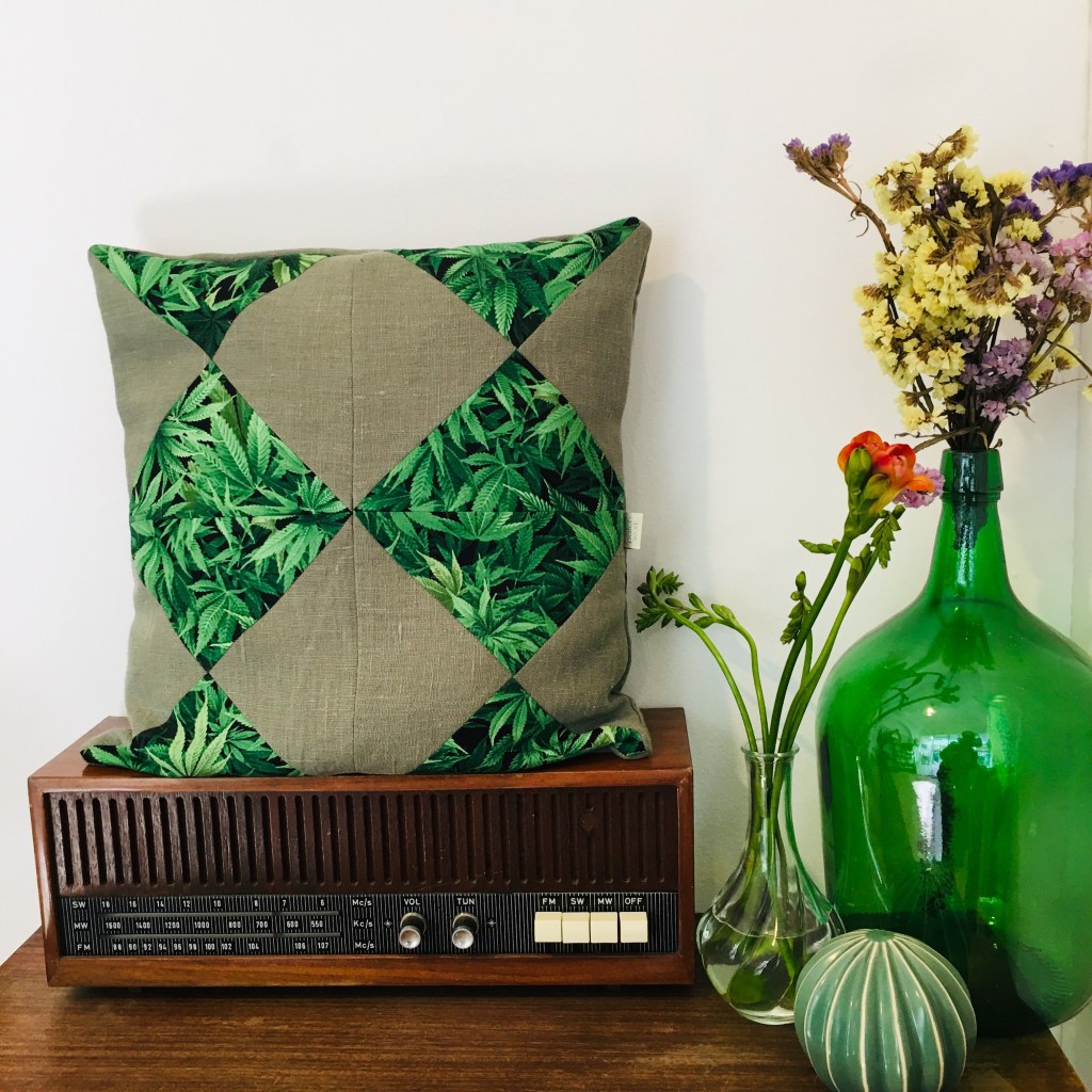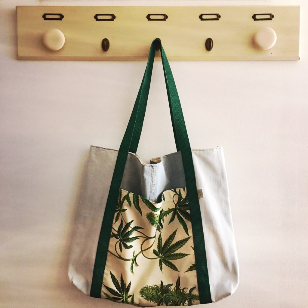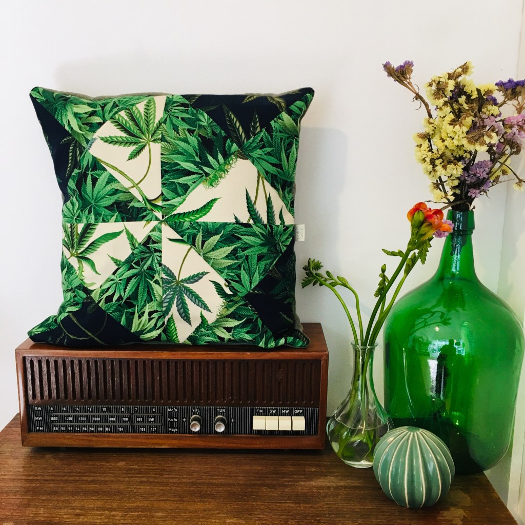 usei tecidos de proveniência portuguesa e um estampado de canvas com folhas da planta cannabis sativa.