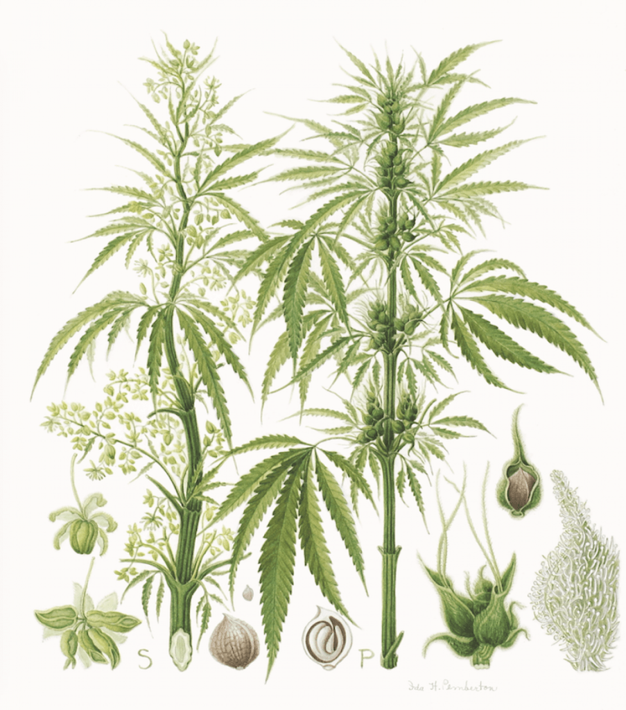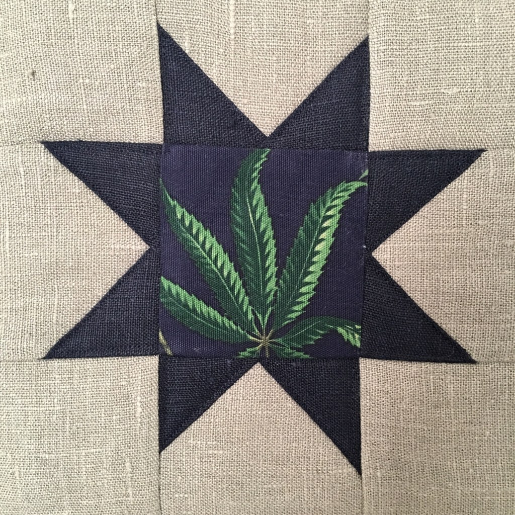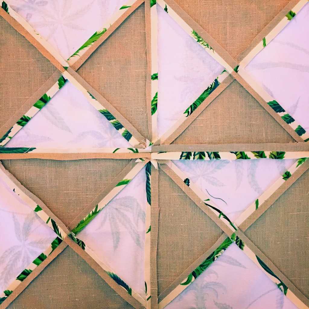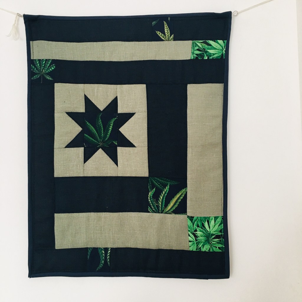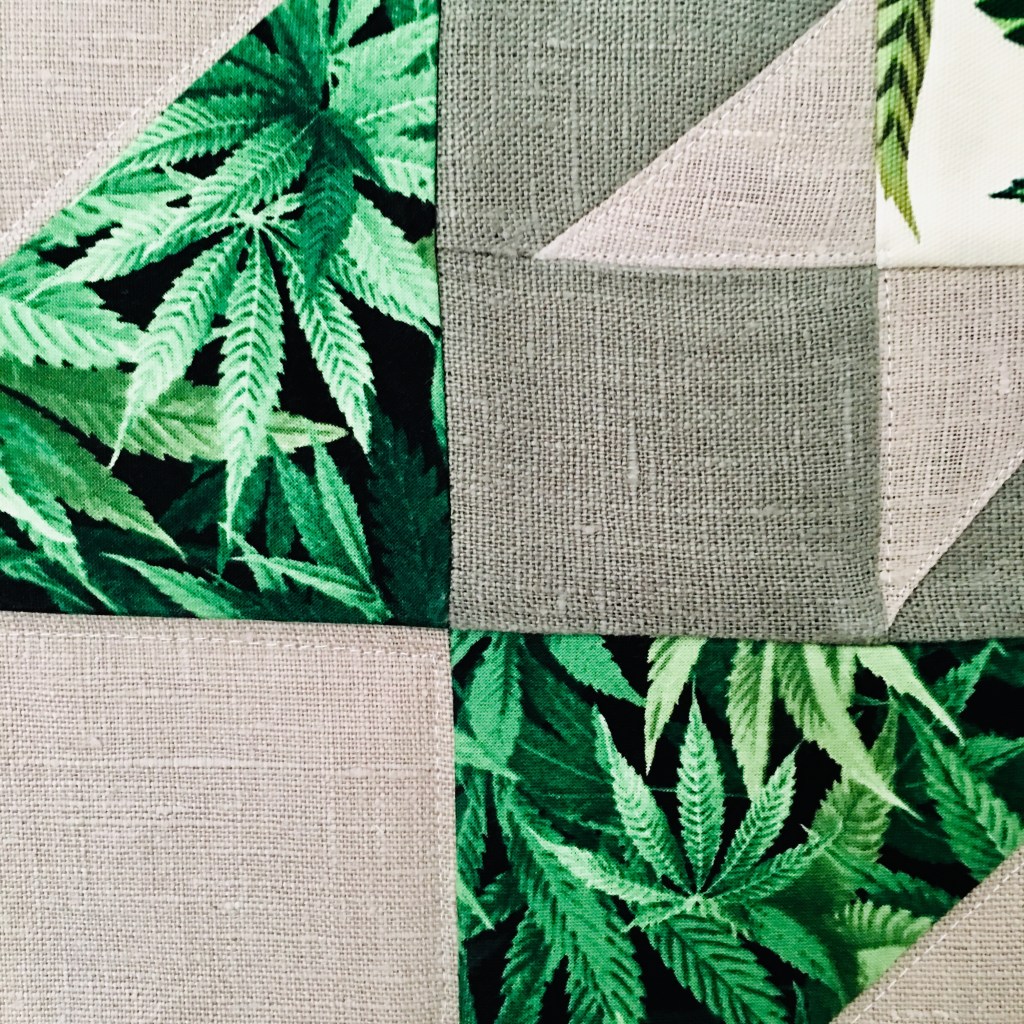 usei tecidos de proveniência portuguesa e um estampado de canvas com folhas da planta cannabis sativa.