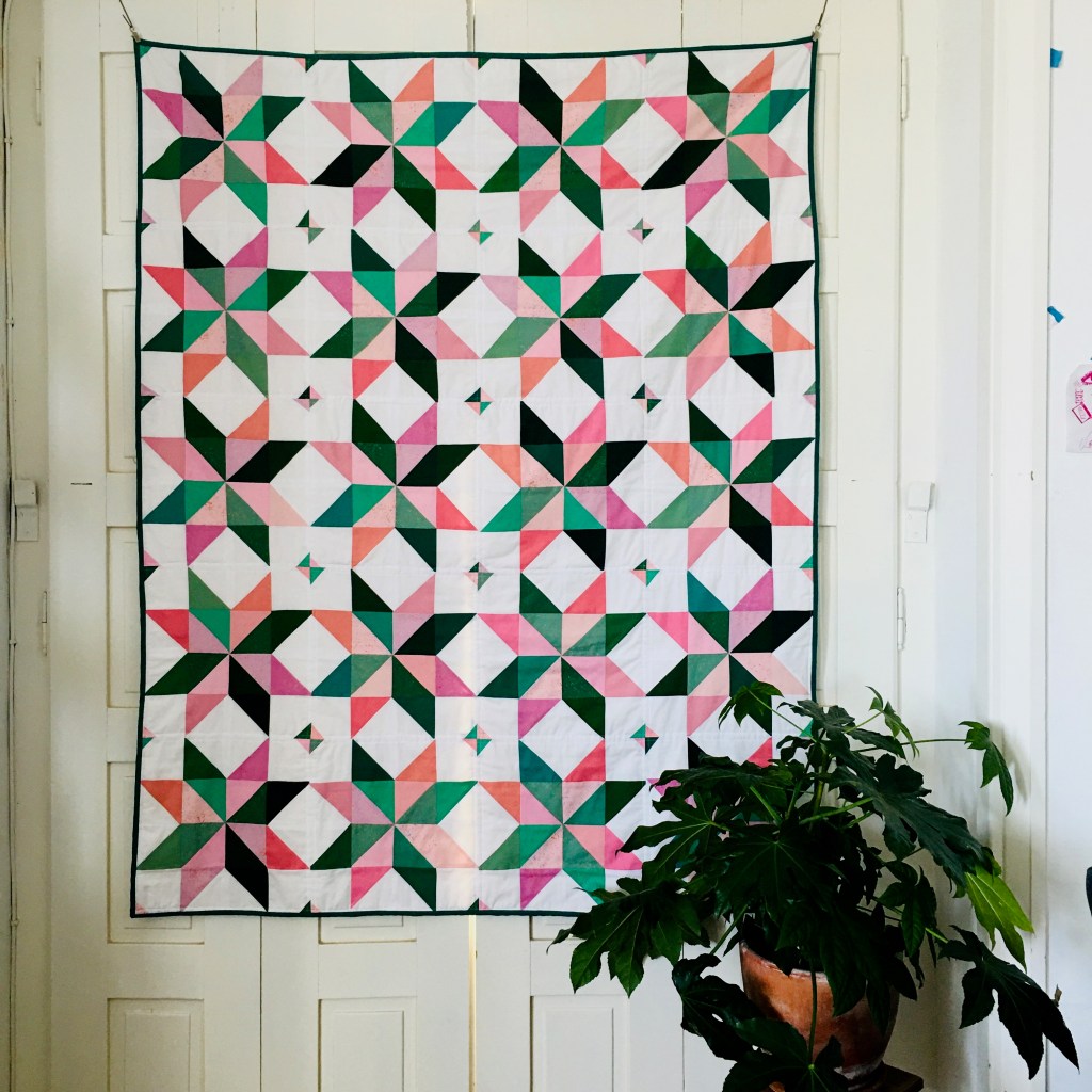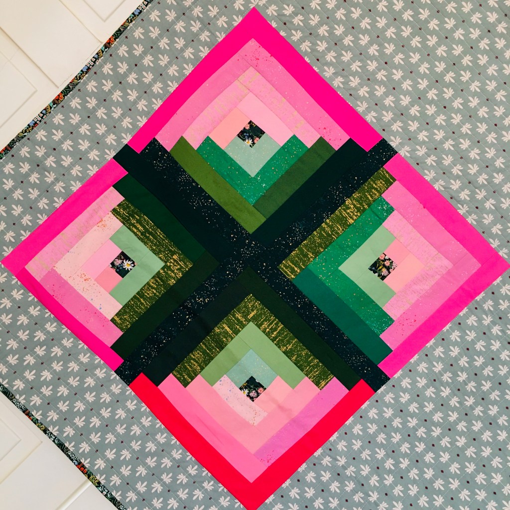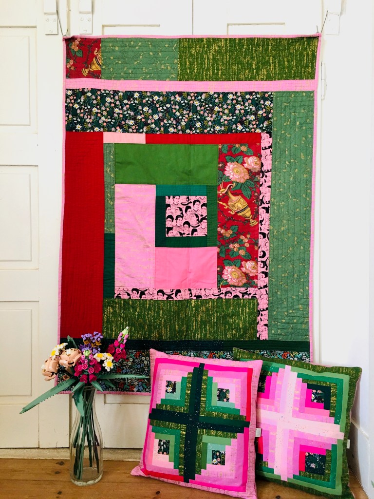 para as almofadas fiz um Log Cabin clássico, com uma cor diferente de cada lado dos quadrados centrais. e depois foi só jogar com a disposição dos blocos, que numa almofada tem o rosa no centro e noutra o verde é a cor central.